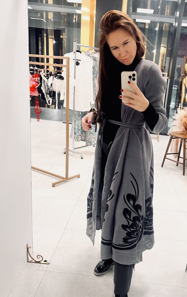 Kimonomantel on valmistatud kergest ja kergelt elastsest materjalist, mis langeb kaunilt ja sobitub mugavalt suurustele S kuni XL. Tänu universaalsuurusele istub see erineva kehatüübi puhul hästi – kas avatud või vööga kinnitatuna.